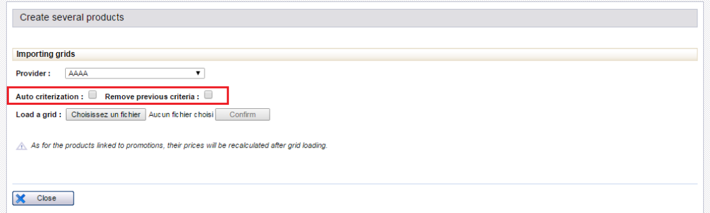 The first check box allows you to activate an “Automatic criteria” option. If this box is ticked, columns with names beginning with “CRITERION_” (see new grid template) will be analysed and products given criteria accordingly.
