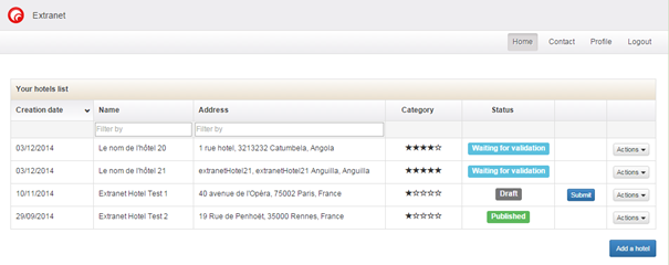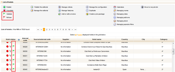 For a hotel operator to sell their hotels through a distributor, the latter must have validated each of the hotels. As we saw earlier, the hotel can be given several statuses which indicate its state of advancement. When the hotel operator decides to submit their hotel, the distributor will then either validate or refuse it. To do this, two new actions are available in the “Hotels” tab of the administration tool :
