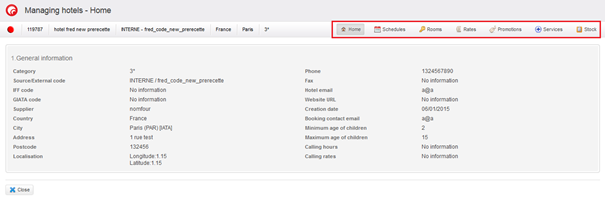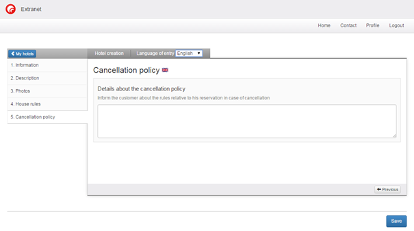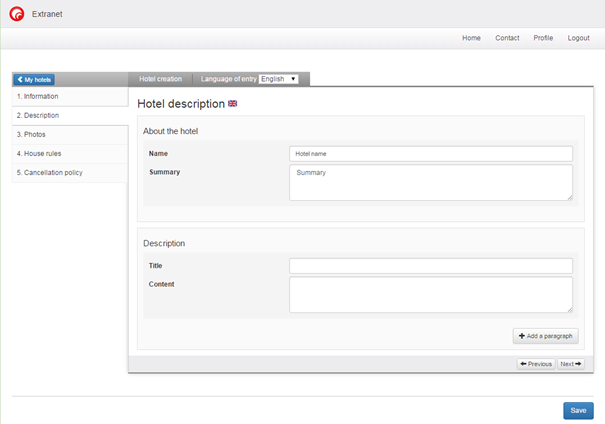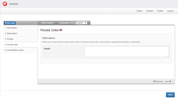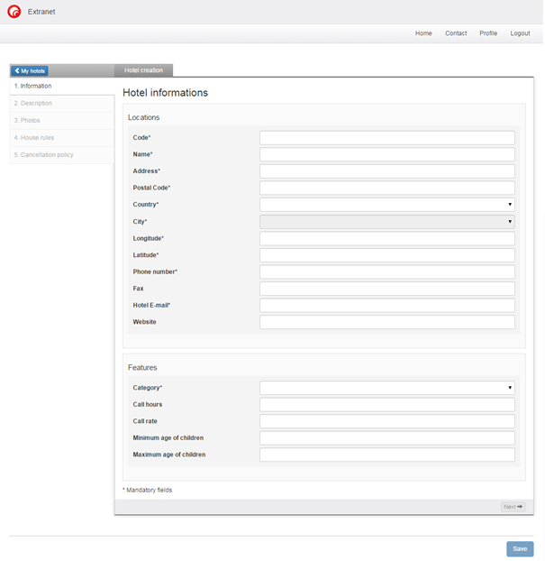 The first stage includes the hotel’s general characteristics. To identify the hotel the operator must choose a unique code. Once the code has been chosen, it cannot be modified. Until this stage has been completed it is impossible to go to the next stage. Once the main information has been entered it is possible to complete the other stages in any order, or even to ignore some stages. Each stage that is entered is automatically saved when the hotel operator passes to the next stage. Consequently, an operator can start entering hotels without being obliged to finish them. They can pick up where they left off later.