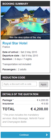 This bar includes the order block, the reduction codes, the quote and the validation buttons all at once. The quote section has been redesigned, in particular, with the addition of an asterisk indicating services included in the stay.