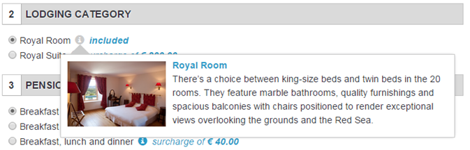 Unlike the former booking process, the prices for each element are no longer the price difference based on the user’s choices. For example, if the user chooses 2 single rooms, the “included” information for the double room with “supplement of €100” for the 2 single rooms will remain unchanged.
