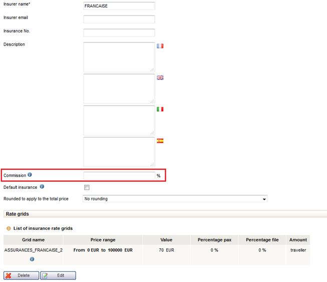 The administration tool now allows you to enter a commission value (as a percentage) for each type of internal insurance. This commission value will be taken into account during the booking process and is visible in the customer file generated in the Back Office (next to the pricing line for insurance).