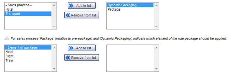When configuring a cost or a reduction, if the “Package” or “Dynamic package” sales process is selected, a new section is displayed allowing you to specify the package elements.