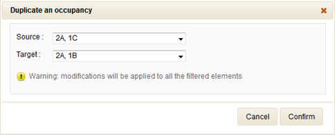 The pop-up that opens allows you to define the source occupancy (the one you want a copy) and the target occupancy (the one you want to fill). You must then confirm in order to duplicate prices.