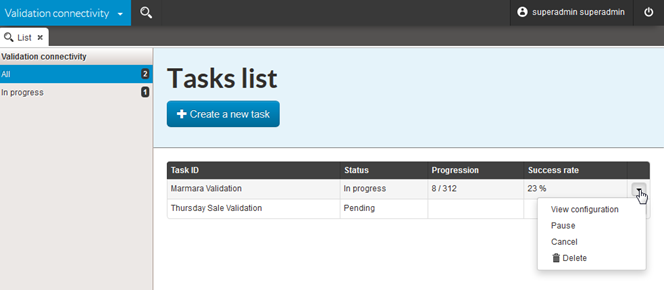 Several validation tasks can be programmed and executed in parallel (with a configurable limit). The home page shows a list of tasks and their status :