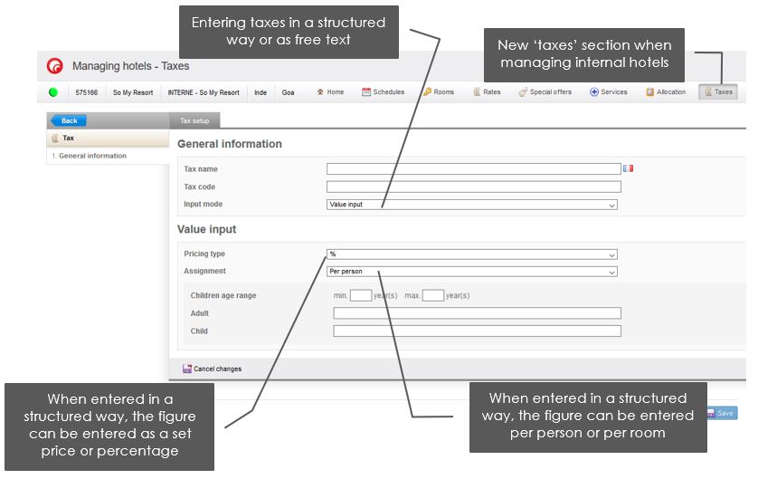 Where ? Entries made in the Orchestra administration tool, ‘hotels’ tab, ‘manage taxes’ action. Within the hotels, dynamic packages and à la carte booking processes, the information will be displayed in a section called ‘taxes not included, to be paid locally’ at the top of the quote page.