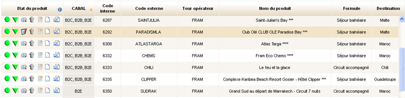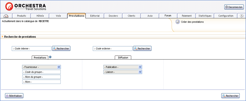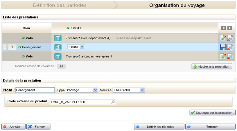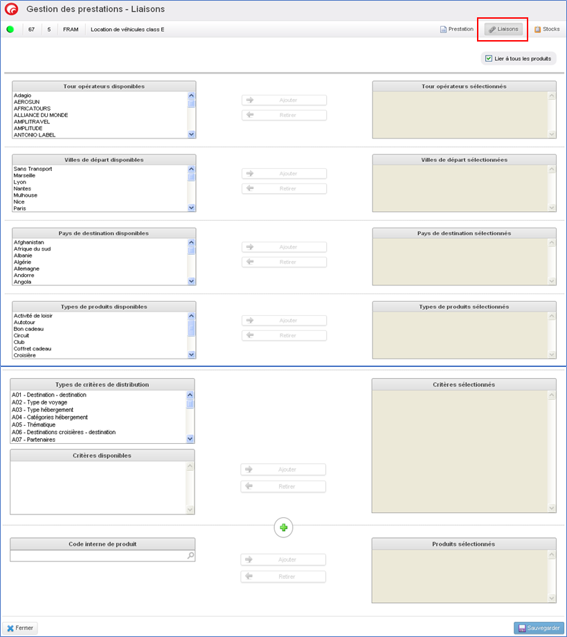 Il est également possible de réaliser des liaisons entre la prestation et les produits packages afin de les associer et de permettre leur revente conjointe sur le processus de réservation. Il est possible de lier la prestation sélectionnée massivement à l’ensemble des produits du catalogue ou plus finement en fonction du producteur, de la ville de départ, du pays de destination, du type de produit ou des critères. Il est également possible de lier la prestation à un produit spécifique en indiquant le code du produit.