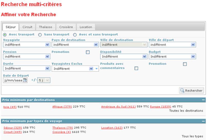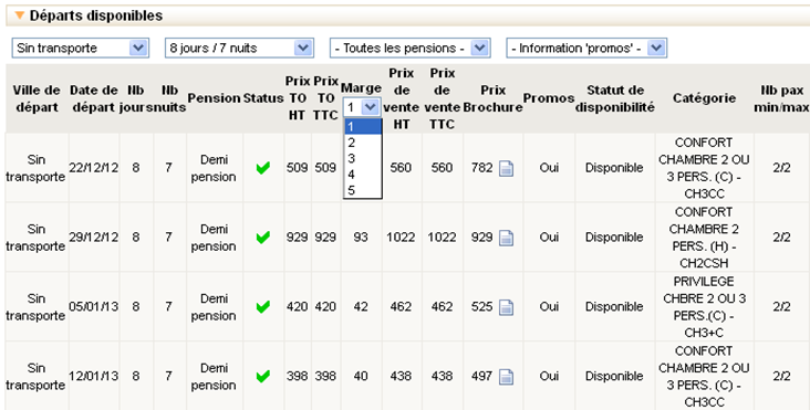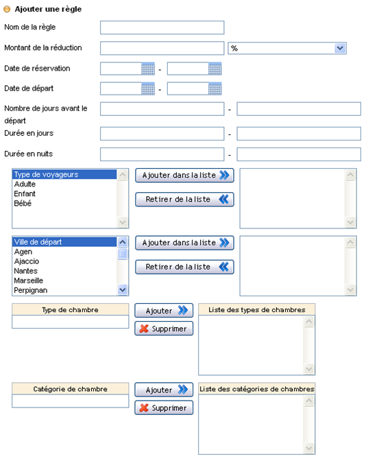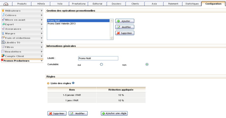 Il est possible de créer des règles promotionnelles en valeur ou en pourcentage. Elles peuvent être définies en fonction de différents critères : dates de réservations, dates de départ, délai d’anticipation, durée du séjour, type de voyageurs, villes de départ, types de chambre et catégories de chambres (lorsqu’elles existent dans la grille tarifaires des produits internes).