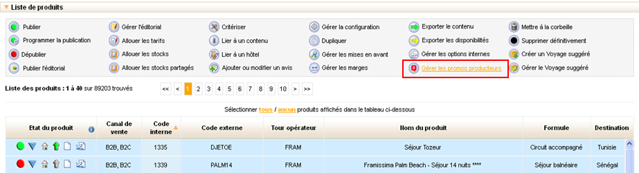 Une fois créées, il est possible de choisir sur quels produits les offres promotionnelles sont applicables à partir de l’onglet Produit via l’action « Gérer les promos producteurs ».
