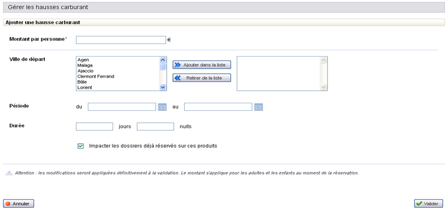 La hausse carburant peut être configurée en fonction de la ville de départ, de la période de dates de départ et des durées de séjour.