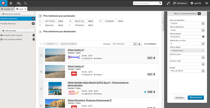 Dans la barre de gauche, des recherches pré-enregistrées peuvent être paramétrées. Juste en dessous, des listes de produits favoris peuvent être créées par l’utilisateur.