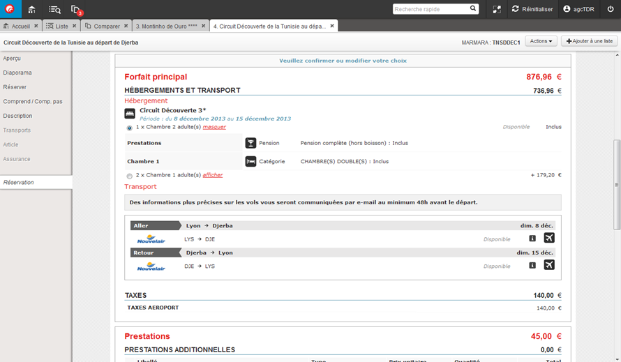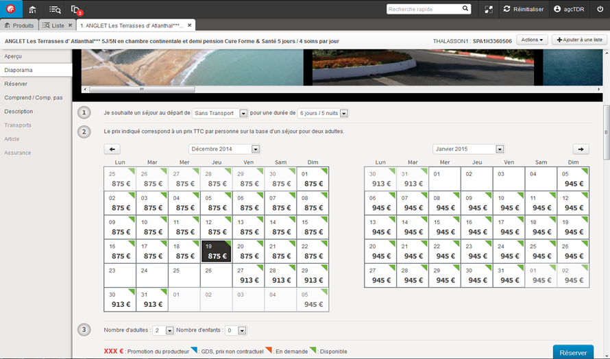 Le processus de réservation ne s’ouvre plus dans une nouvelle fenêtre. Il est désormais intégré à la fiche produit et apparaît sous la forme d’un onglet « Réservation » dans la barre de gauche. Cet onglet permet de continuer à naviguer dans les différentes zones de la fiche produit et de revenir à la réservation en cours à tout moment. Il est également possible de lancer une réservation sur plusieurs produits simultanément.