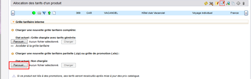 Cette grille de promotions se charge pour un produit donné, au même endroit que pour les chargements de grilles packages partielles : Popup « Allouer les tarifs » du produit désiré, puis dans la section « Charger une nouvelle grille tarifaire partielle (.zip) ou grille de promotion (.xls) ».