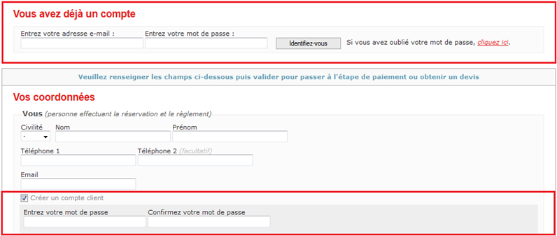 Dans ce mode, la saisie du formulaire d’identification est facultative. Si le client n’a pas encore de compte, il peut le créer lors de réservation. Pour cela, une nouvelle option « Créer un compte client » est proposée sur la page des coordonnées. Il suffit de remplir les champs « Entrer votre mot de passe » et « Confirmer votre mot de passe » en plus des autres coordonnées déjà saisies sur cette page. Si le client ne souhaite pas créer un compte, il suffit de décocher l’option « Créer un compte » et continuer la réservation.