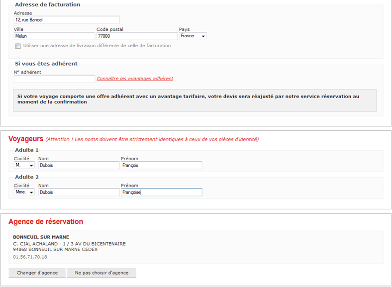 Dès que ses coordonnées sont remplies, l’adresse de l’agence la plus proche est sélectionnée en bas de la page dans la partie ‘Agence de réservation’. Il est également possible d’en changer ou de ne pas en choisir.