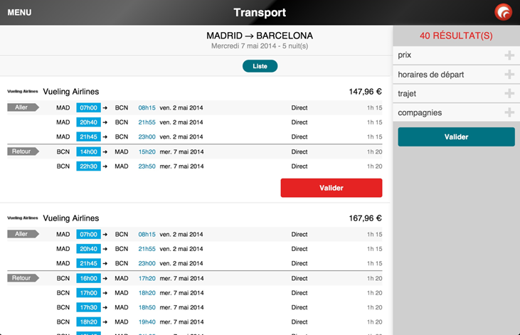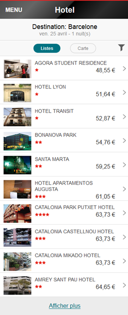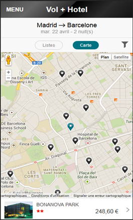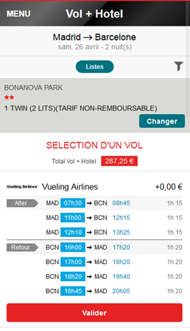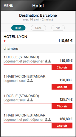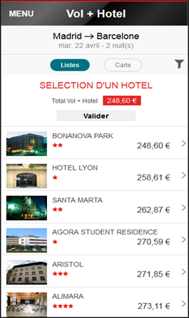 Comme pour la version ordinateur, le client choisi d’abord son hôtel, sa chambre, puis le vol souhaité. La combinaison « vol + hôtel » la moins chère est affichée en haut de la liste et il est possible de valider immédiatement ce choix par défaut.