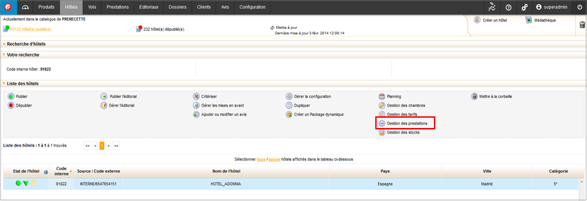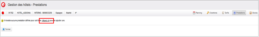 Pour créer ces prestations, il suffit de sélectionner un hôtel interne et cliquer sur le lien «Gestion des prestations».