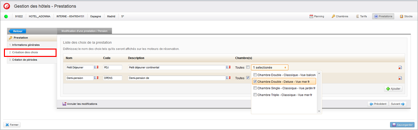 La deuxième étape permet de créer les choix de la prestation : petit-déjeuner et demi-pension pour une prestation de type pension par exemple. Ces choix peuvent être associés à tous les types de chambres ou seulement à certaines.