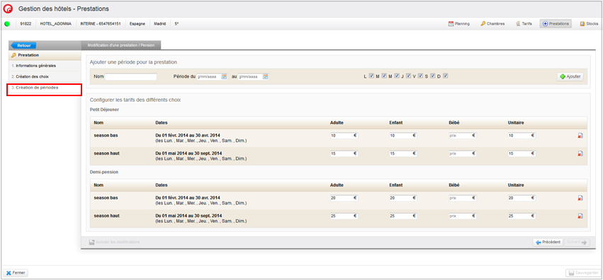 La dernière étape permet de définir les périodes d’application et les prix de la prestation pour chacune de ces périodes.