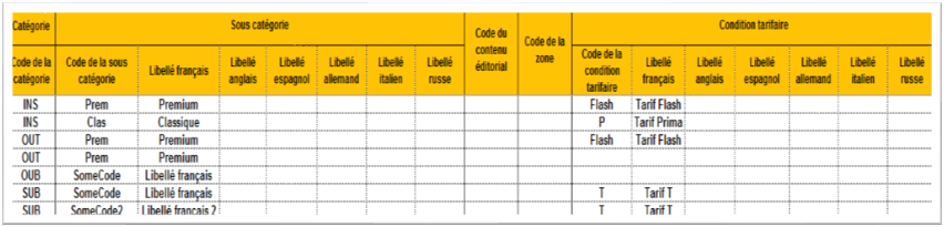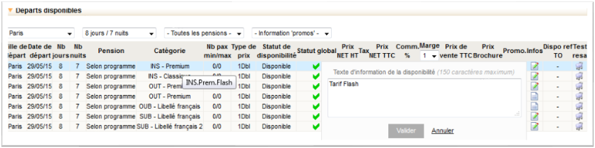 Une fois la grille chargée, les disponibilités catalogue sont visibles sur la fiche produit de l’outil d’administration. Si on laisse la souris sur le libellé de catégorie d’une ligne, on peut voir le code composé des données venant de la grille (Exemple : « INS.Prem.Flash »). C’est ce code qu’il faudra utiliser dans la grille des stocks si l’on souhaite associer des stocks à ces disponibilités.