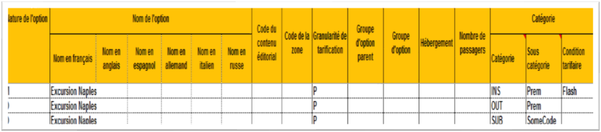 Pour créer une option (obligatoire ou facultative) dans la feuille « Options », le type de cabine, la catégorie et le code tarifaire doivent être les mêmes que ceux de la disponibilité.