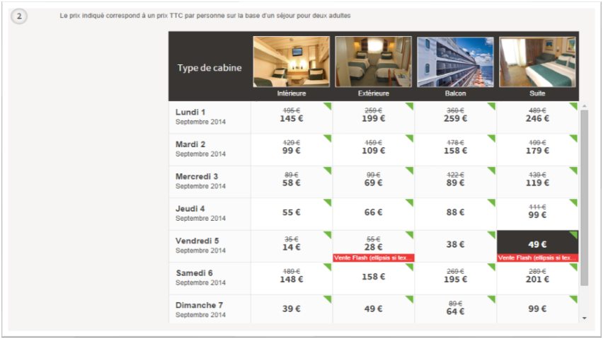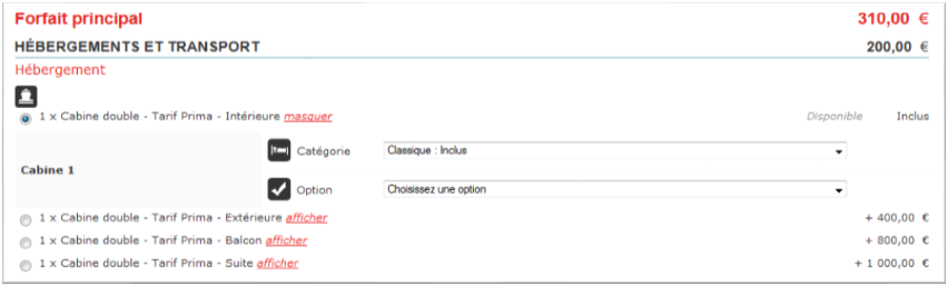 Le premier niveau présente le type de tarif associé ainsi que le type de la cabine (« Tarif Flash – Intérieure » par exemple). Le deuxième niveau permet de choisir la catégorie de la cabine.