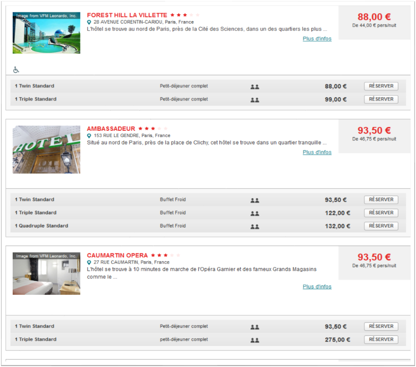 Les hôtels « Forest Hill La Villette » et « Caumartin Opéra » sont proposés uniquement par la source « GTA », donc il n’y a pas de choix à faire, ils sont affichés sur la page de résultats avec les prix donnés par la source « GTA ». En revanche, pour l’hôtel « Ambassadeur », des chambres disponibles sont proposées à la fois par la source « GTA » et la source « Transhotel ». La chambre la moins chère étant proposée par « Transhotel », c’est le résultat donné par « Transhotel » qui sera affiché pour cet hôtel. Sur la page de résultats affichée à l’utilisateur, on trouve donc des hôtels venant de sources hôtelières différentes. Selon l’hôtel qu’il sélectionnera, l’utilisateur pourra donc finaliser sa réservation par le biais d’une source ou d’une autre, en toute transparence.