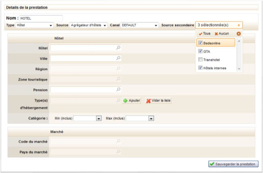 La liste des sources hôtelières à agréger est configurable pour chaque processus de réservation. L’utilisateur peut effectuer une recherche avec des critères génériques qui ne dépendront pas des sources configurées.