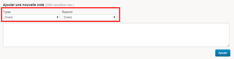 L’utilisateur peut désormais attribuer un type et une raison à une note. Les valeurs de ces select-box sont configurables.