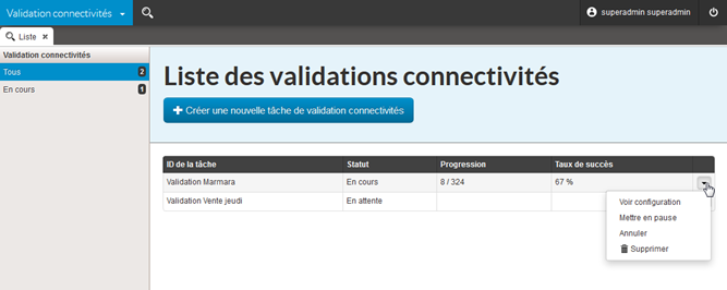 Plusieurs tâches de validation peuvent être programmées et exécutées en parallèle (avec une limite configurable). La page d’accueil présente la liste des tâches et leurs statuts :