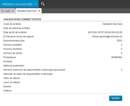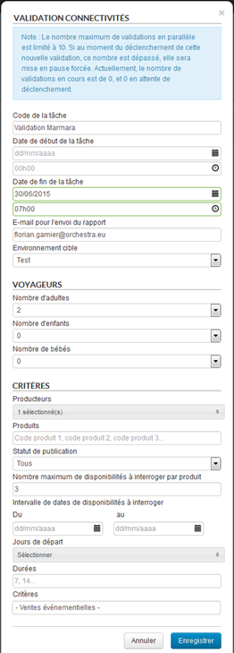 Le bouton « Créer une nouvelle tâche » fait apparaître un formulaire permettant de définir le programme de validation d’un producteur. Son déclenchement peut être programmé en saisissant une date de début, et son exécution peut être stoppée automatiquement en saisissant une date limite de fin (au cas où la validation ne serait pas terminée, afin d’éviter une exécution trop longue ou une charge trop importante sur le serveur du producteur).