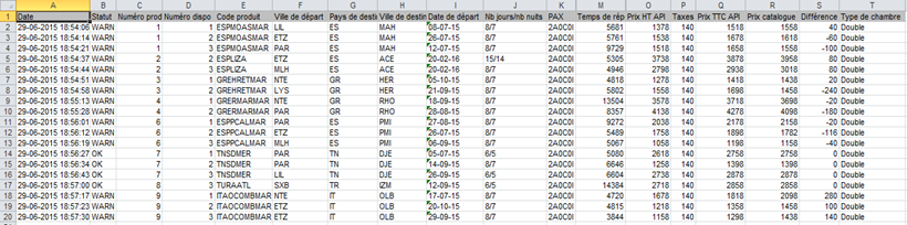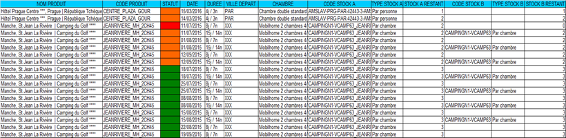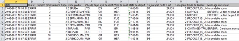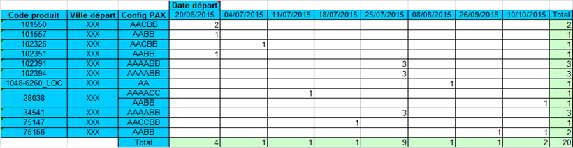 Par exemple, un rapport peut être défini avec le produit, la ville de départ et la configuration de passagers pour l’axe horizontal et la date de départ pour l’axe vertical. Le corps du mail contient un récapitulatif par produit (ou par producteur) de ces statistiques.