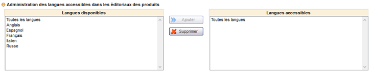 La deuxième section concerne l’administration des langues accessibles dans les éditoriaux des produits. Ceci permet de restreindre les droits des utilisateurs afin qu’ils ne puissent gérer qu’une langue précise d’éditorial.