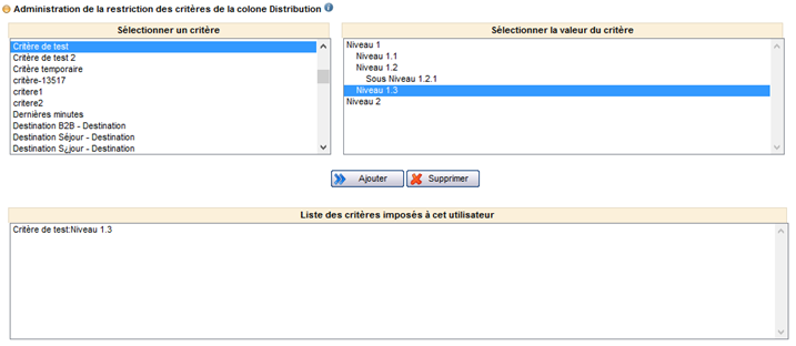 La troisième section concerne l’administration des restrictions des critères distributeurs. Ceci permet de restreindre les données accessibles aux utilisateurs dans les moteurs de recherche de l’outil d’administration. Cette configuration doit être associée au droit « Restreindre les critères » pour chacun des onglets que l’on souhaite impacter. Dans l’exemple ci-dessous, l’utilisateur n’aura accès qu’aux produits critérisés avec la valeur « Niveau 1.3 » sur le critère sélectionné.