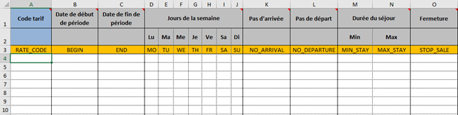 Cette nouvelle grille est composée de feuilles « Catégorie de chambre » permettant de définir à la fois le planning (prix, dates, durées, etc.) et les stocks d’une même chambre. Ce type de feuille peut être dupliqué autant de fois que nécessaire au sein du même fichier Excel, pour chacune des chambres d’un même hôtel.