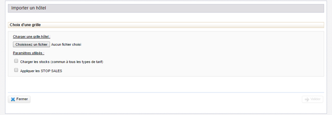 Pour procéder au chargement d’une grille hôtel, il suffit d’accéder à la section « planning » d’un hôtel. Le bouton « menu » à droite du tableau permettra alors de « charger une nouvelle grille ». La popup suivante s’ouvre alors :