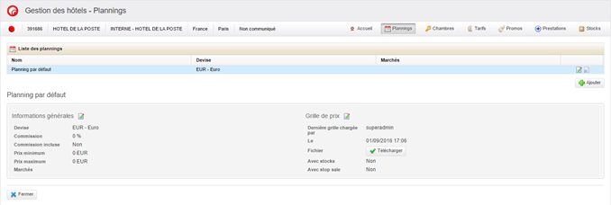 Il est possible de télécharger la dernière grille appliquée pour un couple hôtel / planning. Pour cela, il suffit de se rendre dans l’onglet « Hôtel », sélectionner l’hôtel désiré et accéder au(x) planning(s) de l’hôtel. Le bouton « Télécharger » permet de récupérer le fichier Excel. Les options choisies, l’heure et l’utilisateur ayant chargé cette grille sont également affichés.