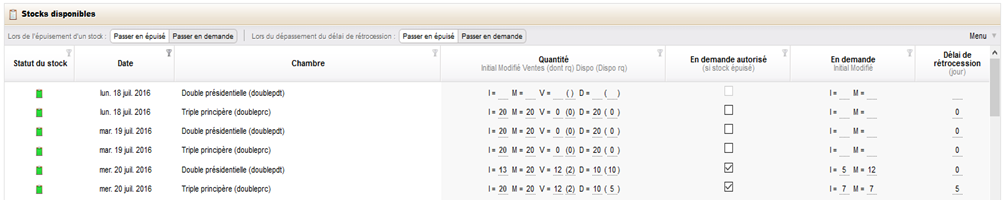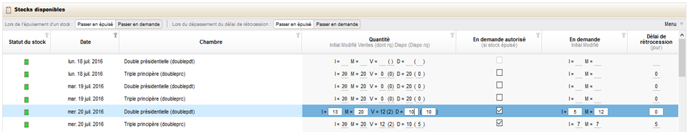 Il est désormais possible de modifier directement la « quantité disponible » ainsi que la « quantité en demande disponible »d’un stock si l’on possède le droit nécessaire (« HOTEL – Stocks – Edition des quantités disponibles »). Ceci a également pour effet de modifier la « quantité modifiée » ainsi que la « quantité d’en demande modifiée ».