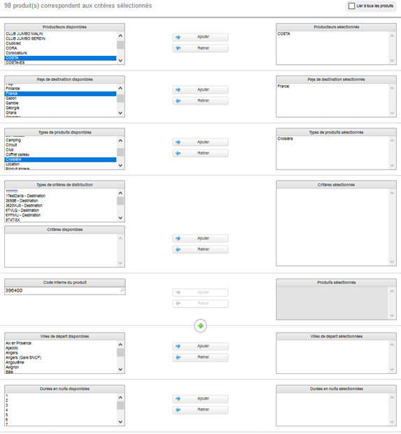 Dans un premier temps, les prestations sont associées à des packages, soit par une liste de codes produits, soit par un ensemble de critères (destination par exemple),