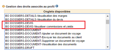 Un nouveau droit Back-office a été ajouté dans l’outil d’administration afin d’afficher les colonnes de commissions et de yields dans la section « Devis » du Back-office.