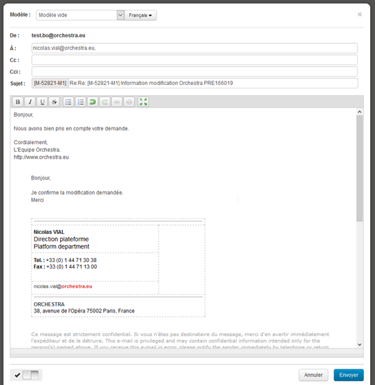 L’interface de gestion des échanges par mail a été améliorée. Lorsque l’utilisateur répond à un mail, l’historique des échanges est désormais affiché dans la fenêtre d’édition.