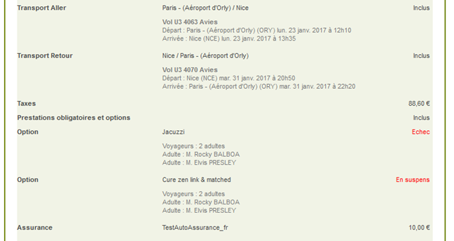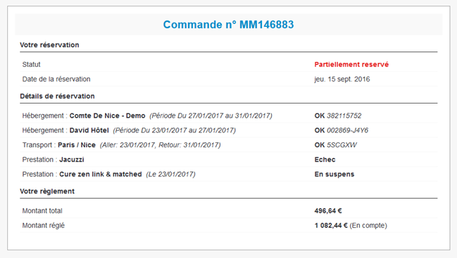 Dans un contexte B2B, la page et le mail de confirmation de la réservation peuvent afficher le statut global de la réservation ainsi que le détail de l’état de chaque prestation. La capture ci-dessous montre par exemple un voyage partiellement réservé car la réservation d’une prestation a échoué.