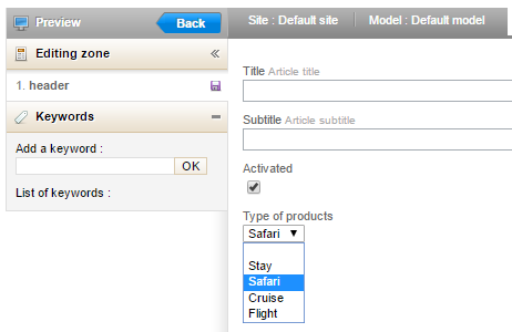 Il est désormais possible de définir des listes déroulantes et des cases à cocher dans vos contenus transverses, disponibles dans l’onglet « éditoriaux ».