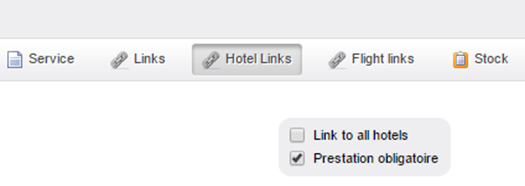 La liaison de prestations à des hôtels et des transports à partir de l’onglet « Prestation » permet à présent de préciser si les prestations liées seront obligatoires ou non au sein du processus de réservation. Ce nouveau mode de liaison ne peut être utilisé que dans les processus hôtel, package dynamique, transport et « à la carte », c’est-à-dire lorsqu’il n’y a pas de calcul de prix « à partir de ».