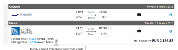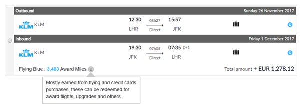 Dans la cartouche présentant un vol aller/retour, le nom du programme de fidélité, le nombre et le type de miles sont présentés au même niveau que le prix total de la combinaison de vols aller/retour en question.