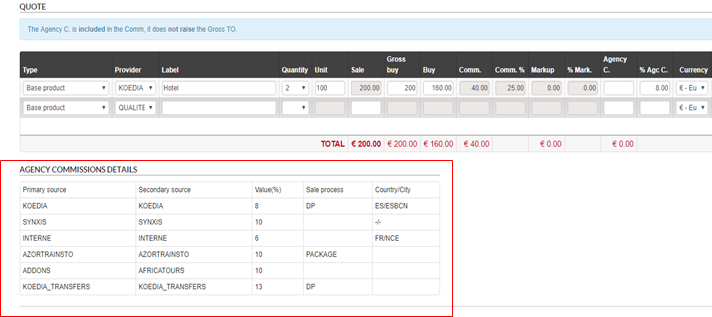 Un tableau récapitulatif des commissions agences est désormais disponible dans la page de devis d’un dossier créé manuellement. Seules les commissions agences applicables sur le canal de réservation du dossier sont affichées.