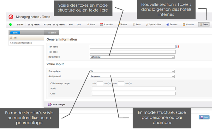 Comment ? L’information des taxes de séjour peut être définie sous forme d’un texte libre, ou de manière structurée en définissant un prix par chambre ou par pax (adulte/enfant) au niveau de l’hôtel. Le montant peut être en valeur fixe ou en pourcentage par rapport au prix de la chambre.