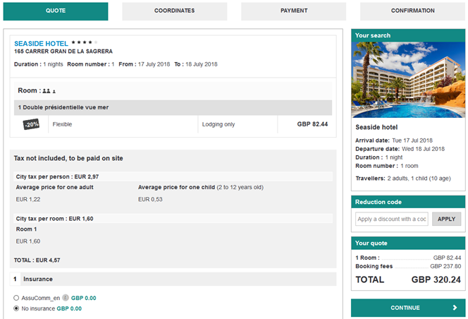 Plusieurs taxes peuvent être configurées. Elles sont uniquement à titre informatif puisqu’elles seront à régler sur place. Un bloc explicatif, sur la page de devis, indique à l’internaute le montant de ces taxes de séjours.