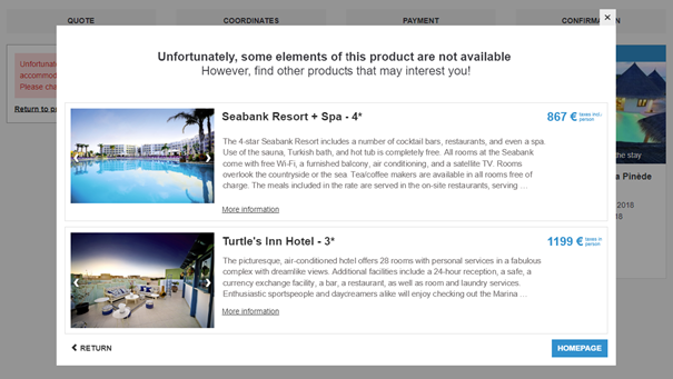 Pourquoi ? Lors d’une recherche de packages sur le processus de réservation il peut arriver que le produit ne soit pas disponible et donc qu’une page de devis « KO » soit affichée à l’utilisateur.
