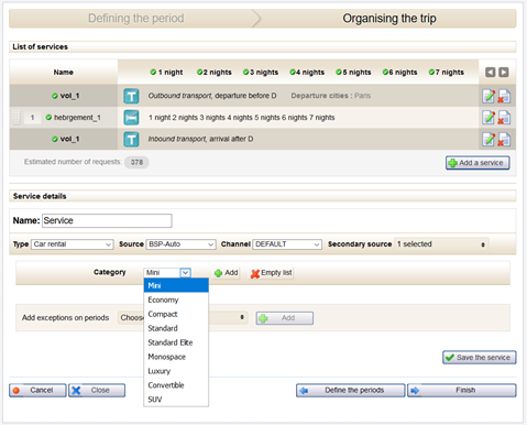 Au niveau des pré-packages, un nouveau type de prestation « Location de voiture » est sélectionnable. Il est ensuite possible de choisir la liste des catégories de voiture que l’on souhaite proposer.